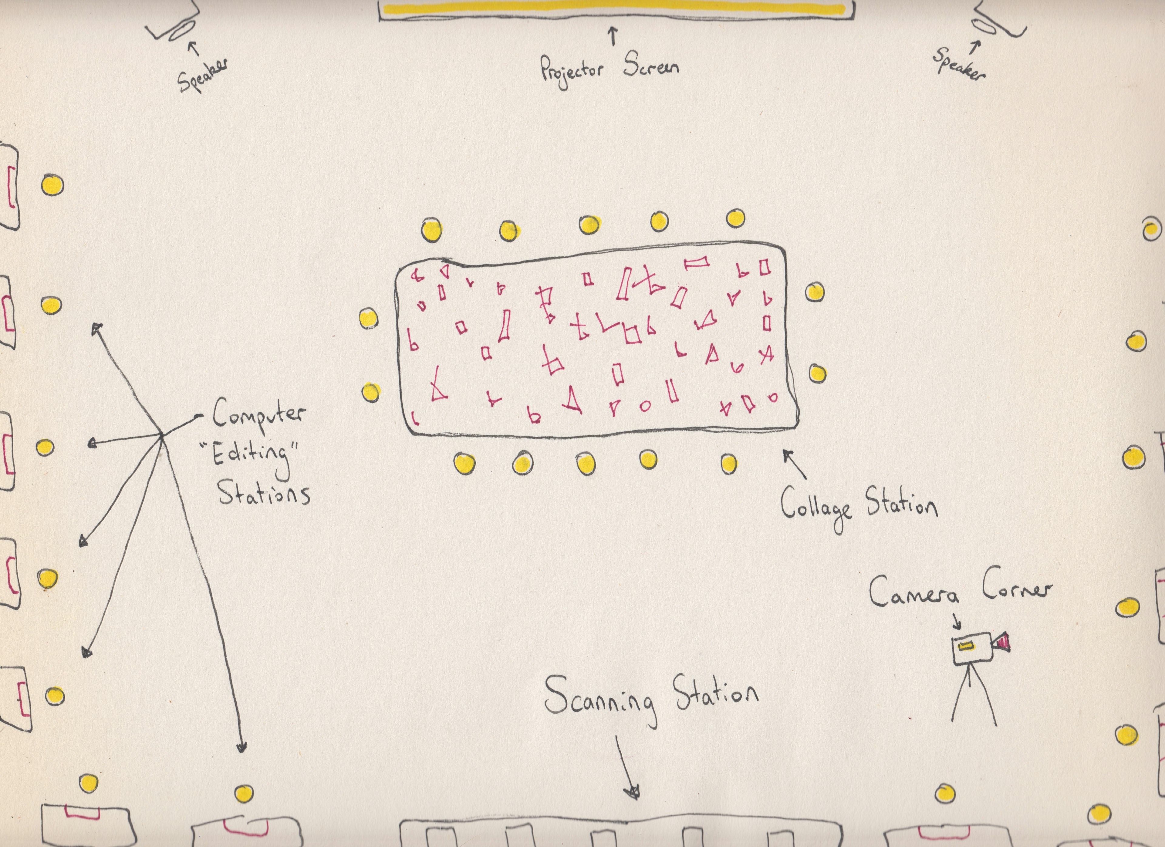 One set of tables can be a station full of magazines and art supplies. Here students will be working with a range of physical forms cutting them out and isolating them. They will do so sitting around a large table. Students will be made aware of what imagery other students are looking for so that they can help each other locate what they may be looking for - kind of like digging through a pile of lego.